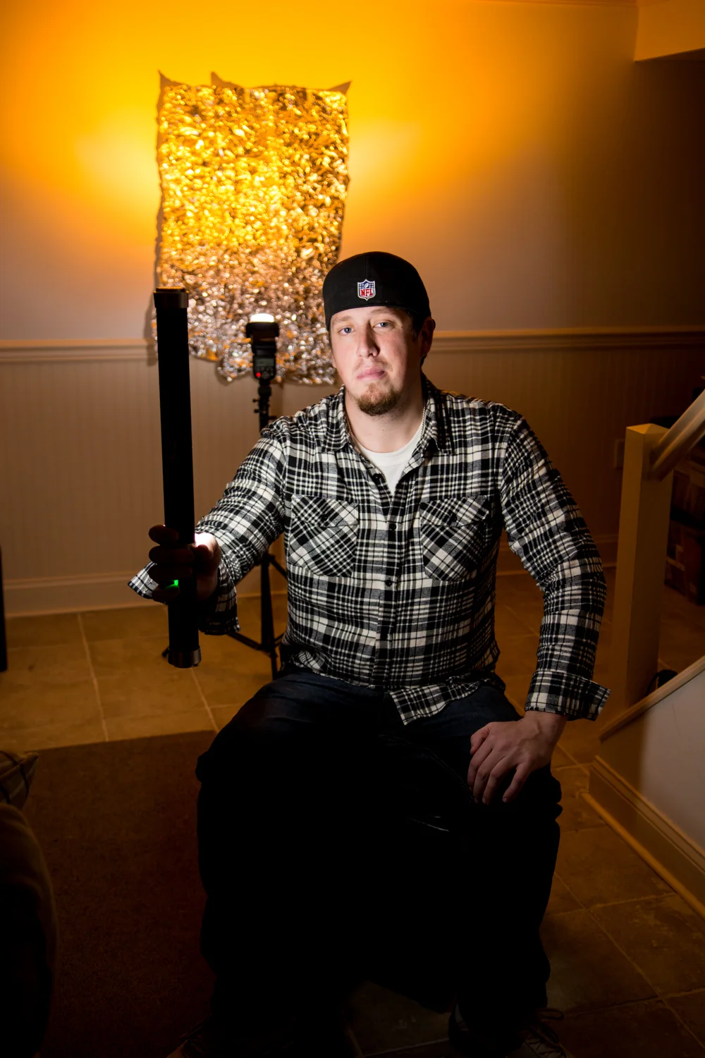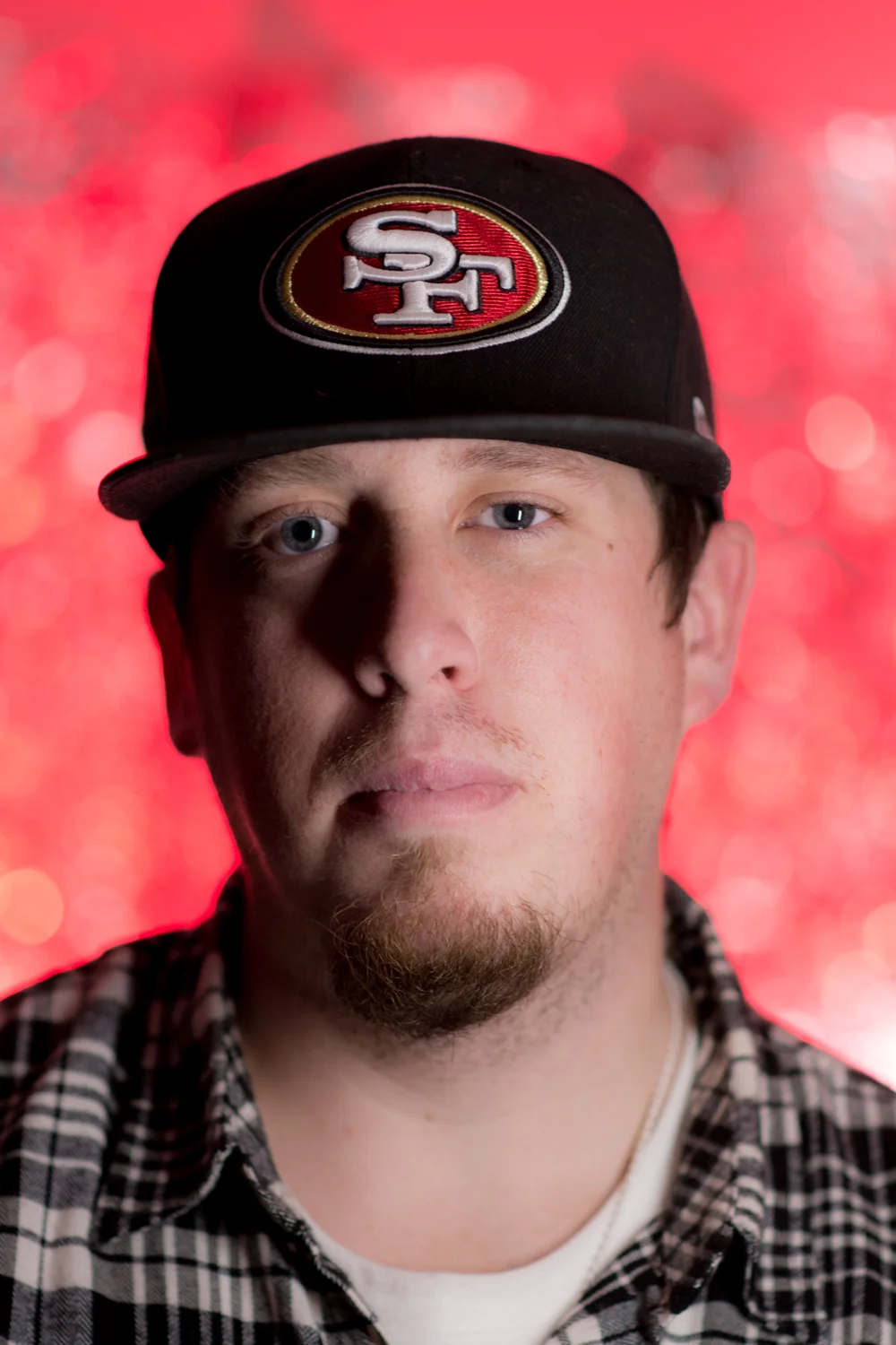I combined last week's Bokeh Wall experiment with some portraiture. The aim here was to get a simple, single-light setup on the subject with a single strobe in the back for the aluminum foil. I primarily bought the light for automotive light-painting, based on the recommendation of the fantastic Andrew Link, renowned automotive photographer. However, seeing as it's exactly hell-frozen-over degrees in New Jersey right now, I figured the better option was to remain indoors and take this for a spin. My friend and fellow amateur photog Scott joined me for some photos (he's a 49ers fan, if you couldn't tell).